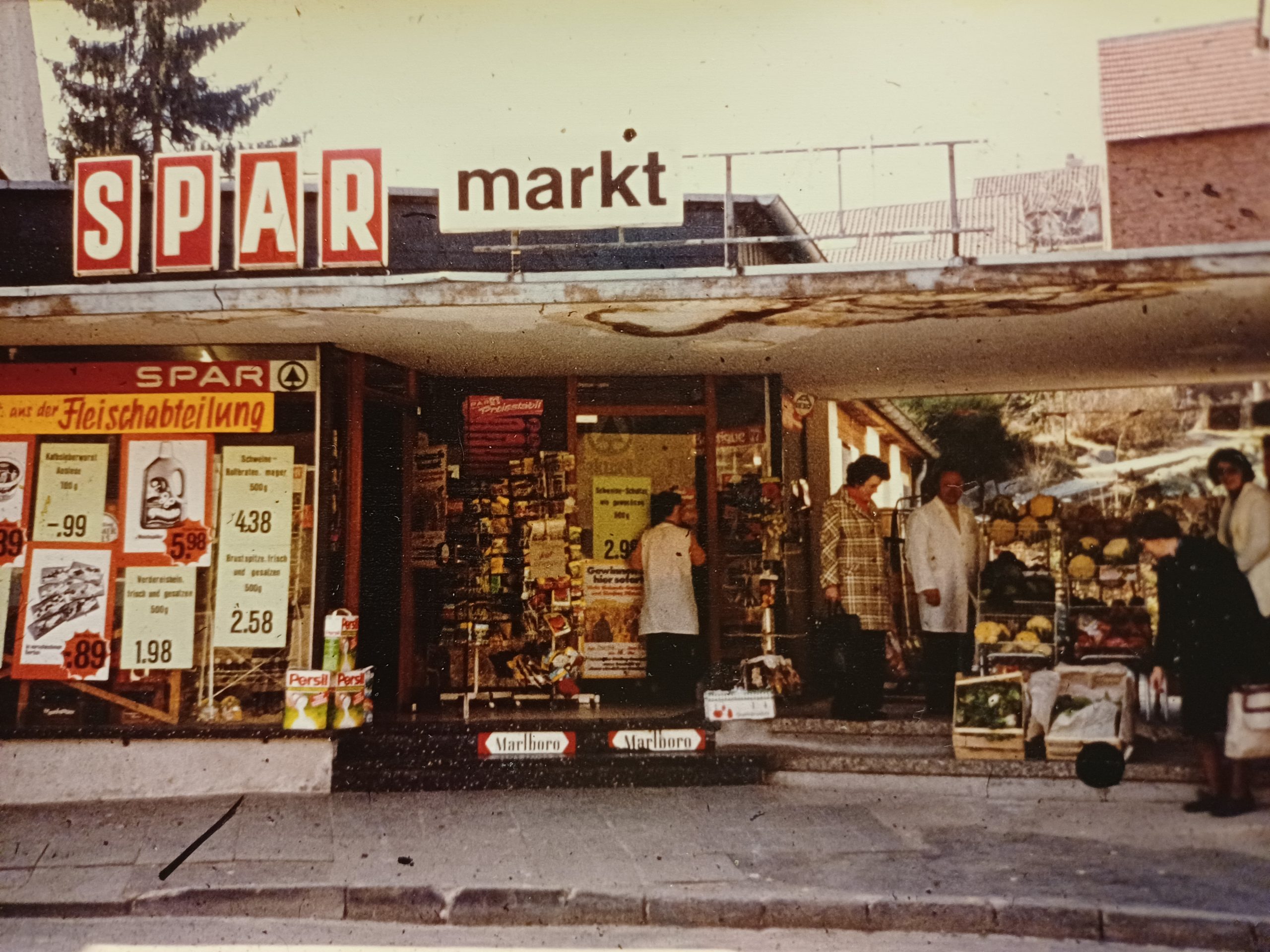 Vor dem Spar gab es auch mal Sonderaktionen, zum Beispiel zwei große Aufsteller „Pikantje van Gouda“ mit lebensgroßen Holländerinnen in Tracht und jeweils drei großen Käselaibern, die vor dem Eingang standen, daneben Marietta, Heinz‘ Tochter, und Gabi Pötz, die im Geschäft angestellt war. Auch Schwiegertochter Edith erinnert sich an den Probierstand mit Verkäuferinnen als „Antje aus Holland“ verkleidet. Auf einem Schild stand: „Wer schätzt am Besten?“ Jetzt ist der Kunde gefragt! „Setzen Sie selbst das Messer an. Wenn Sie genau 500g treffen, erhalten Sie das Stück umsonst!“